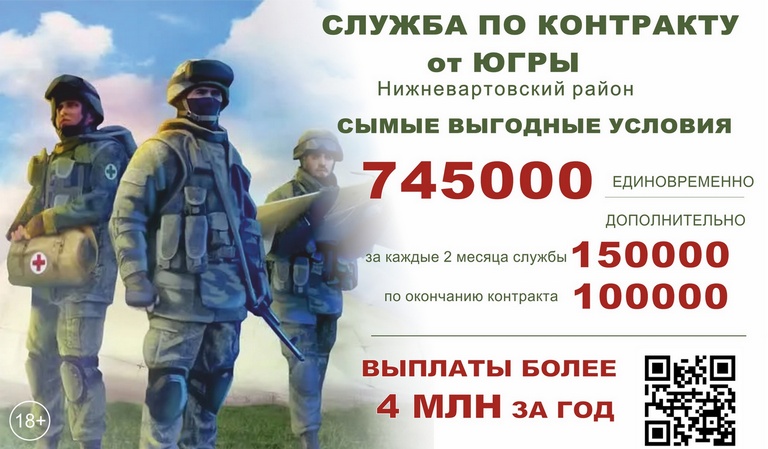 При заключении контракта через военкомат Нижневартовского района Вы получите единовременную выплату в сумме: 745 000 рублей, а общая сумма выплат в год - от 4 млн.руб.